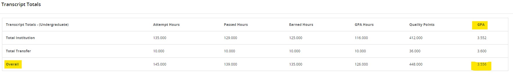 In Self-Service you may view your unofficial transcript at any time. At the bottom of your transcript, right above "Course(s) in Progress" look for "Transcript Totals." We use your overall GPA (see example).